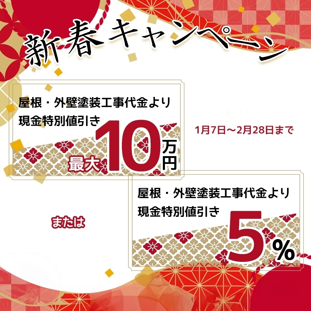 今回はキャンペーン情報の告知です!!! その名も………………. 「新春キャンペーン‼」 内容としましては以下の通りとなります。 2026年1月7日~2月28日までの塗装工事をご契約頂いた方の工事代を特別割引!! ・最大1 […] -
